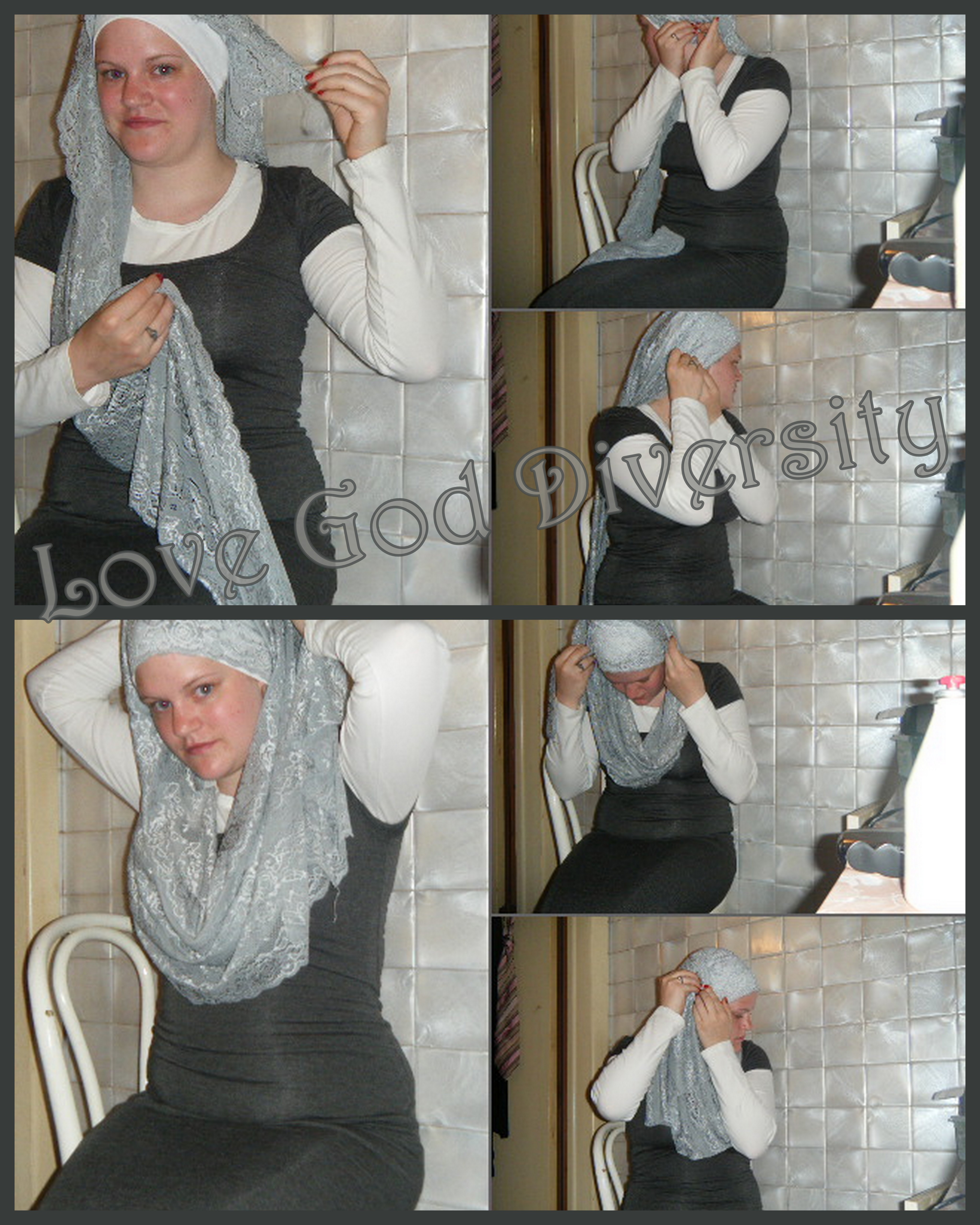 This look requires a shawl, this particular one is made of stretchy lace. Any shawl could be used though, to really accentuate the bohemian look of it, use a cotton scarf and add a small head band around your forehead.This style does require to be tied onto something; while an under-scarf is usually the go-to I usually try to keep it light and use a large fabric head band instead. It allows my head and hair to breathe.