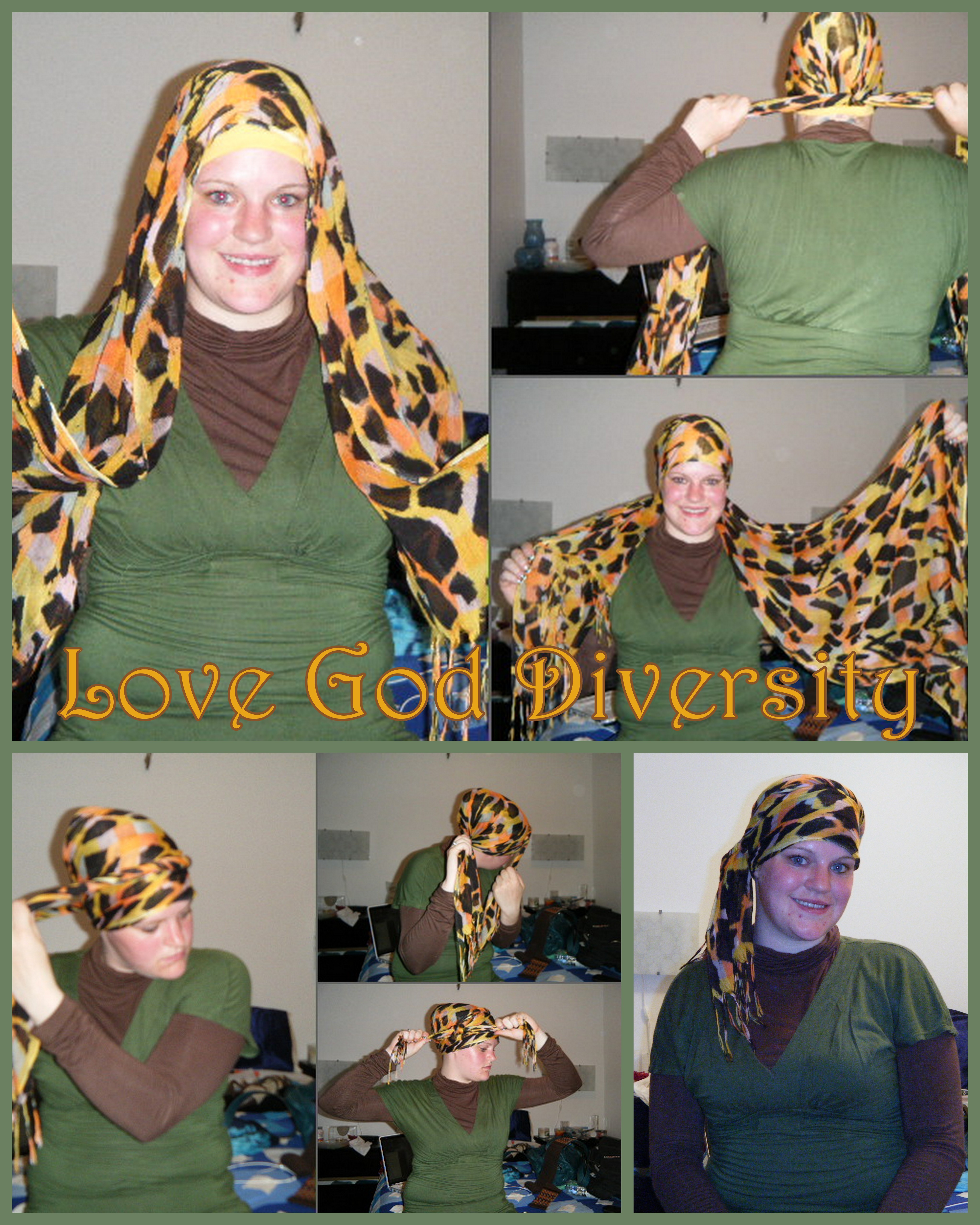 STEP 1 – put the shawl on your head about 1/3 of the way