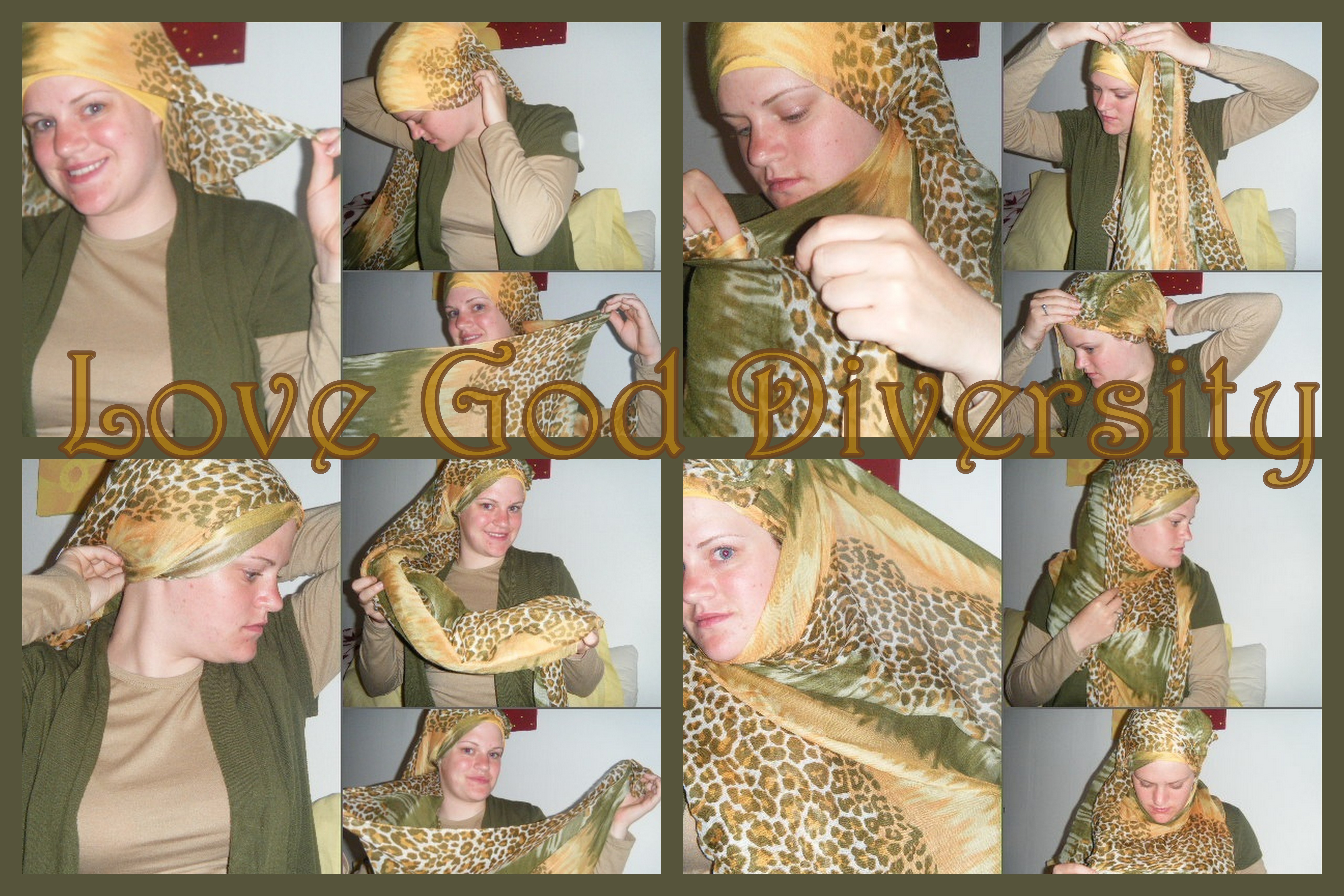 STEP 10 – Wrap the scarf around your head, secure with pins