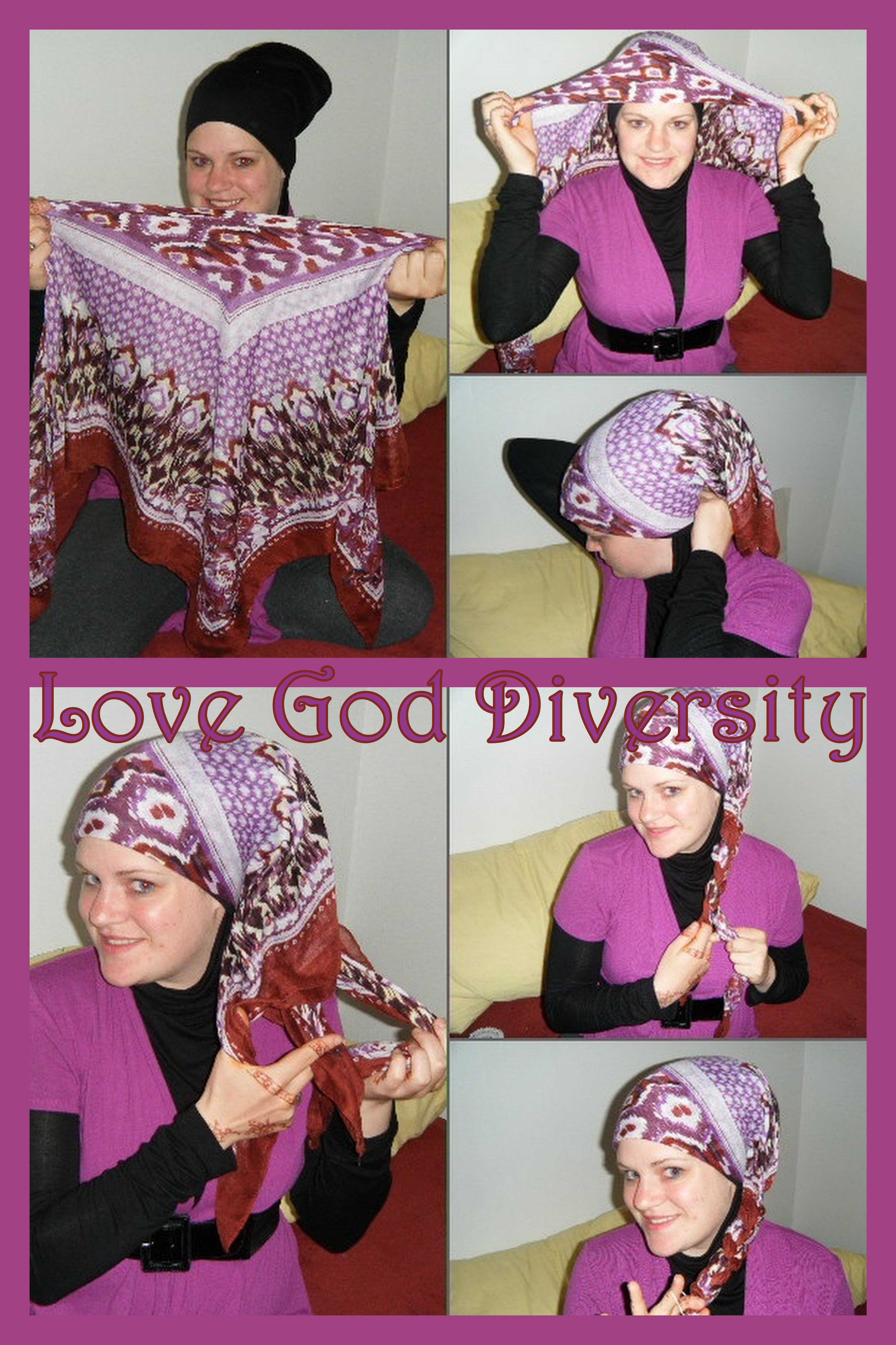 This particular style is super simple, using only one square scarf, an under-scarf and a plastic elastic. It does not cover the neck or chest so if that’s something of importance for you, please consider wearing a turtle-neck shirt or a ninja under-scarf (or consider the “Home-made” version). Also consider some sort of volume contraption, this style definitely looks better with volume.