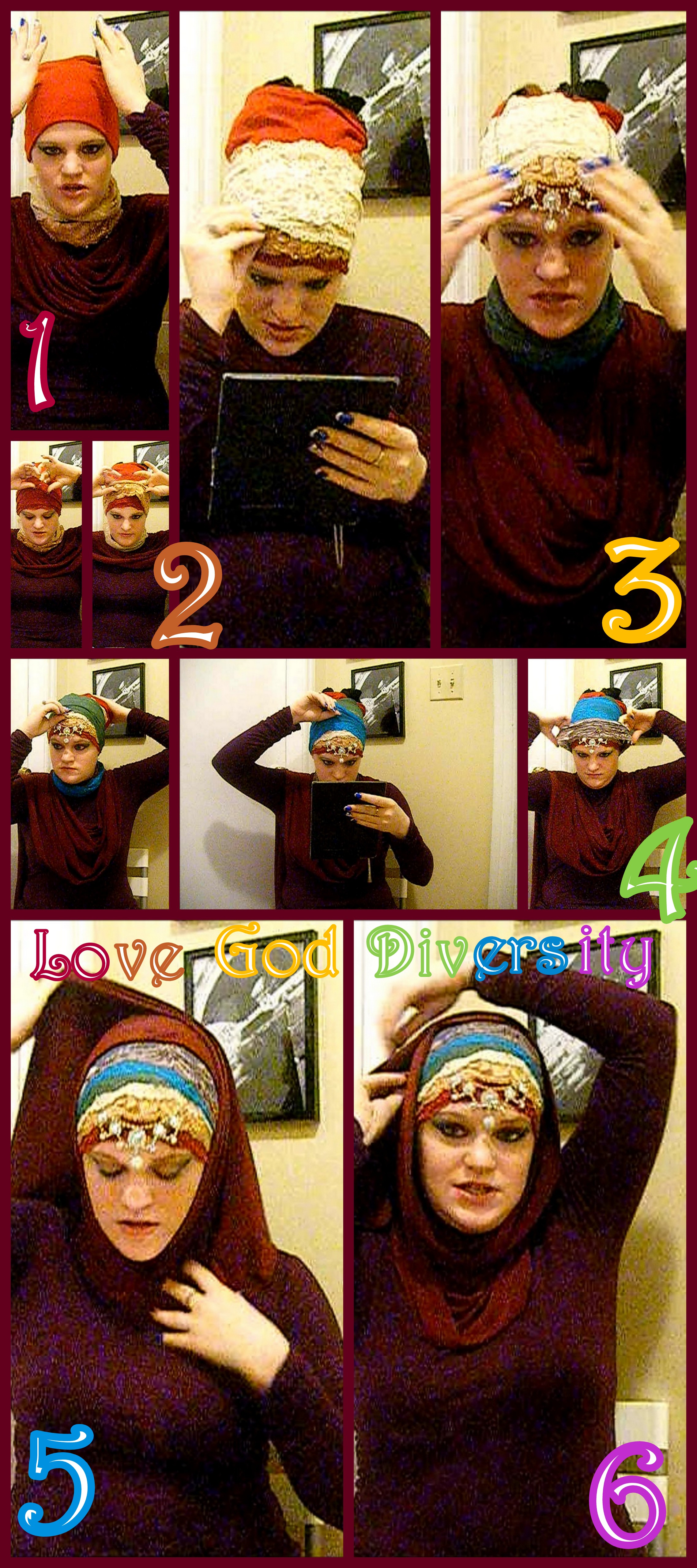 STEP 6–Wrap the shawl loosely in front of your chest and onto your head and secure with a straight pin