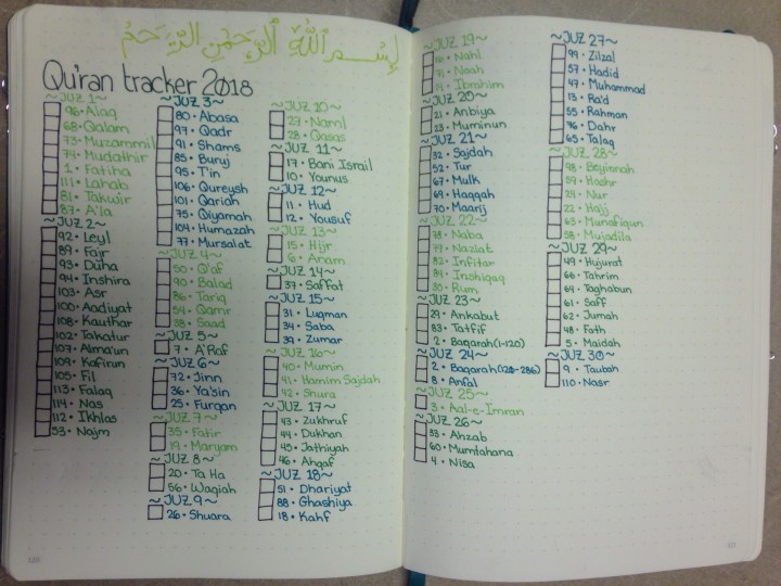 I feel rather off track this Ramadhan but thanks to early planning, I already have a Qu’ran and a Ramadhan tracker set up in my bullet journal: